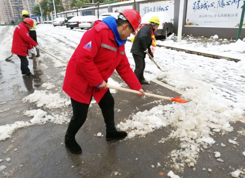 有想法就付諸于行動(dòng),簡(jiǎn)短交流后,員工們開始有效的分工安排,開裝載機(jī)、拿鐵鍬、用掃帚、撒工業(yè)鹽、保障物資等,默契合作。