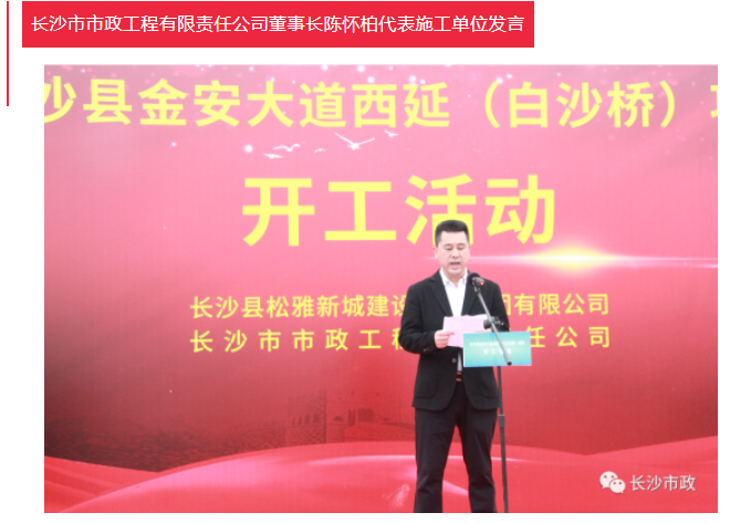 4月19日上午,長(zhǎng)沙縣金安大道(含白沙河橋)西延項(xiàng)目開工活動(dòng)隆重舉行。長(zhǎng)沙市人民政府副秘書長(zhǎng)張躍先,長(zhǎng)沙縣委副書記、縣長(zhǎng)、松雅湖生態(tài)新城建設(shè)指揮部指揮長(zhǎng)陳永高,松雅湖生態(tài)新城建設(shè)指揮部常務(wù)副指揮長(zhǎng)曹偉興,長(zhǎng)沙市市政工程有限責(zé)任公司董事長(zhǎng)陳懷柏出席活動(dòng)。長(zhǎng)沙縣松雅湖生態(tài)新城發(fā)展中心書記羅衛(wèi)滋主持開工活動(dòng)。
